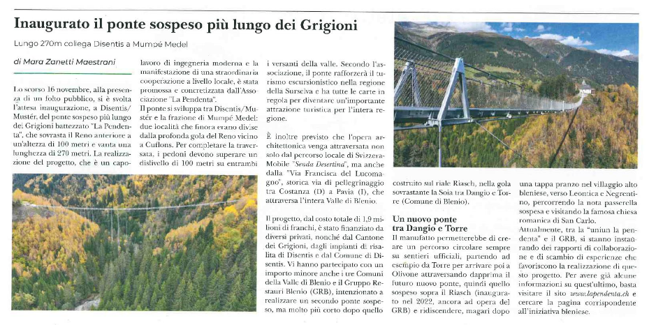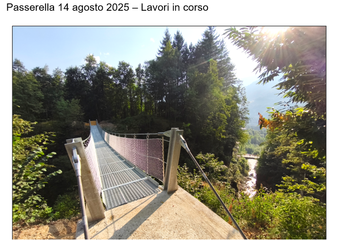 Wenn alles nach Plan verläuft, wird die neue Fussgänger-Hängebrücke über die Gola della Soia bis Ende 2025 fertiggestellt und zugänglich sein. Alle Informationen zum Projekt, Sponsoring-Möglichkeiten und die Projektdokumentation finden Sie hier.