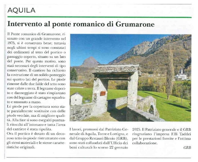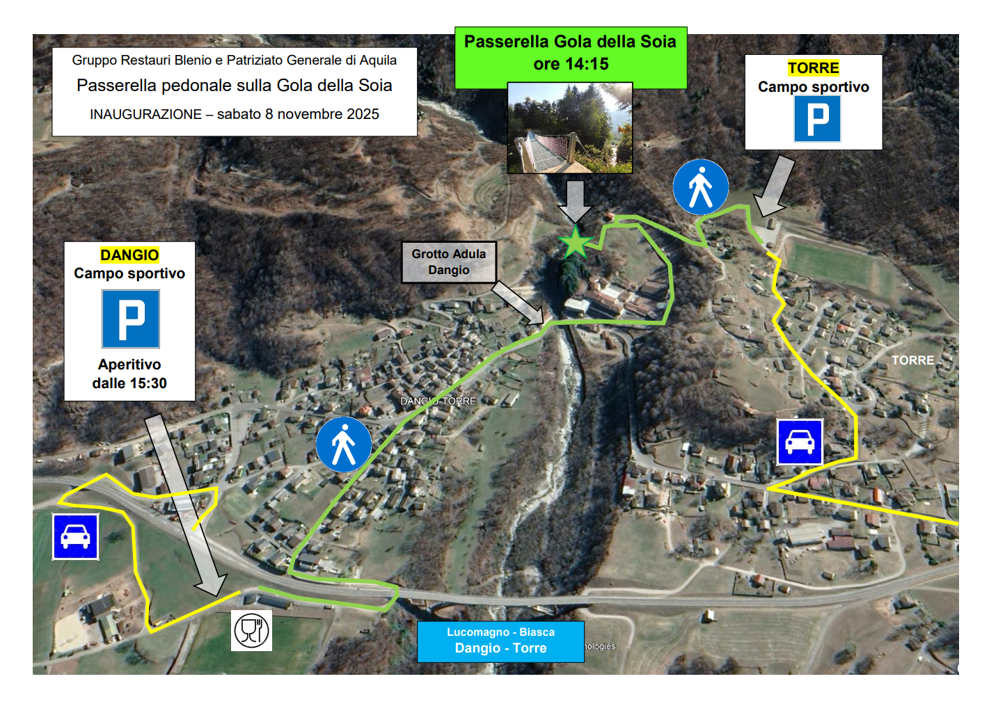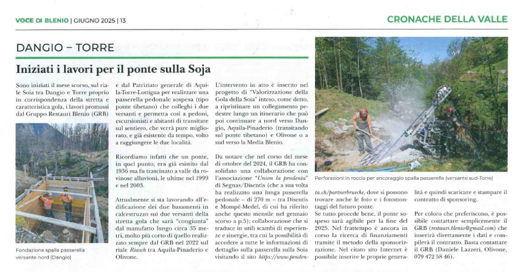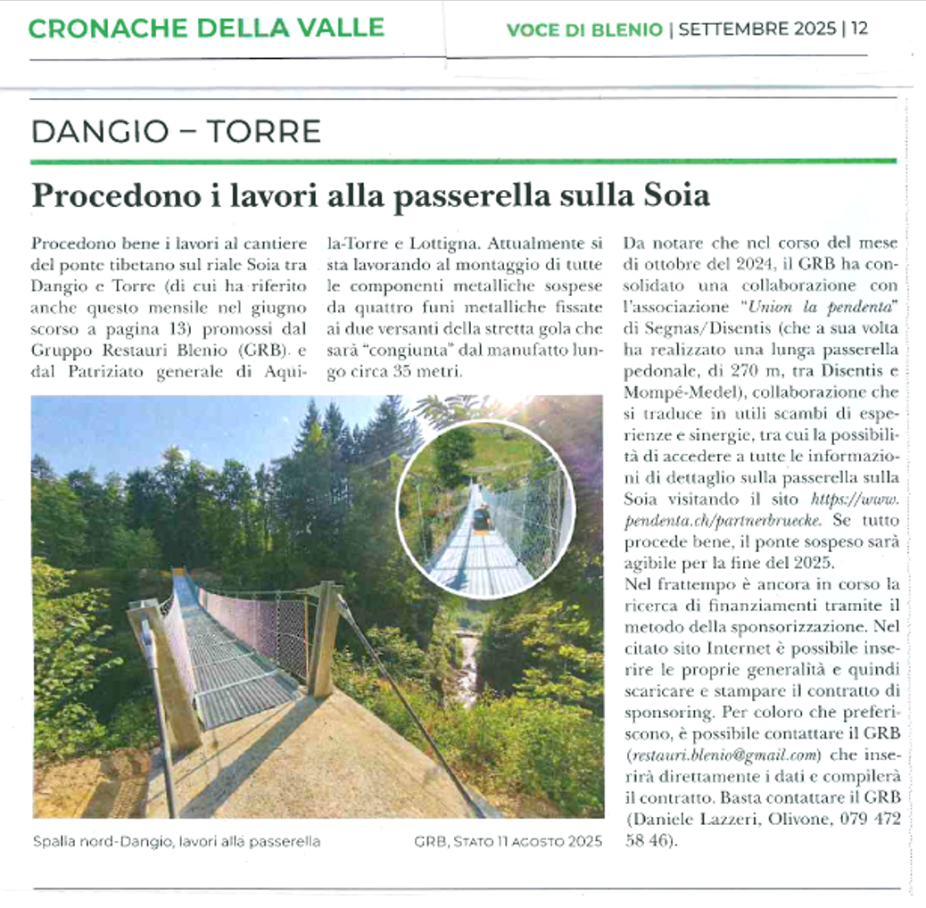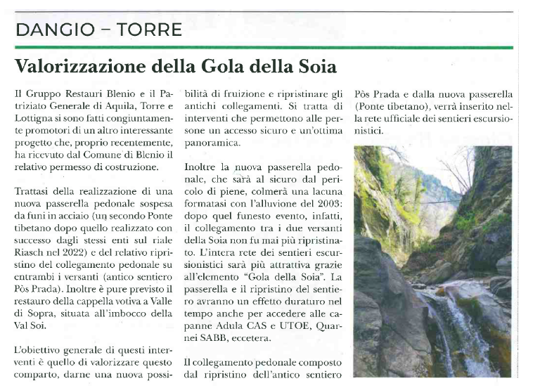 Im Bleniotal, zwischen Dangio und Torre (TI), verläuft die Schlucht des Gebirgsbaches Riale Soia aus dem Val Soia. Hier entsteht mit der Passarella sulla Soia ein weiteres beeindruckendes Gemeinschaftswerk. Initiiert vom Gruppo Restauri Blenio (GRB) und dem